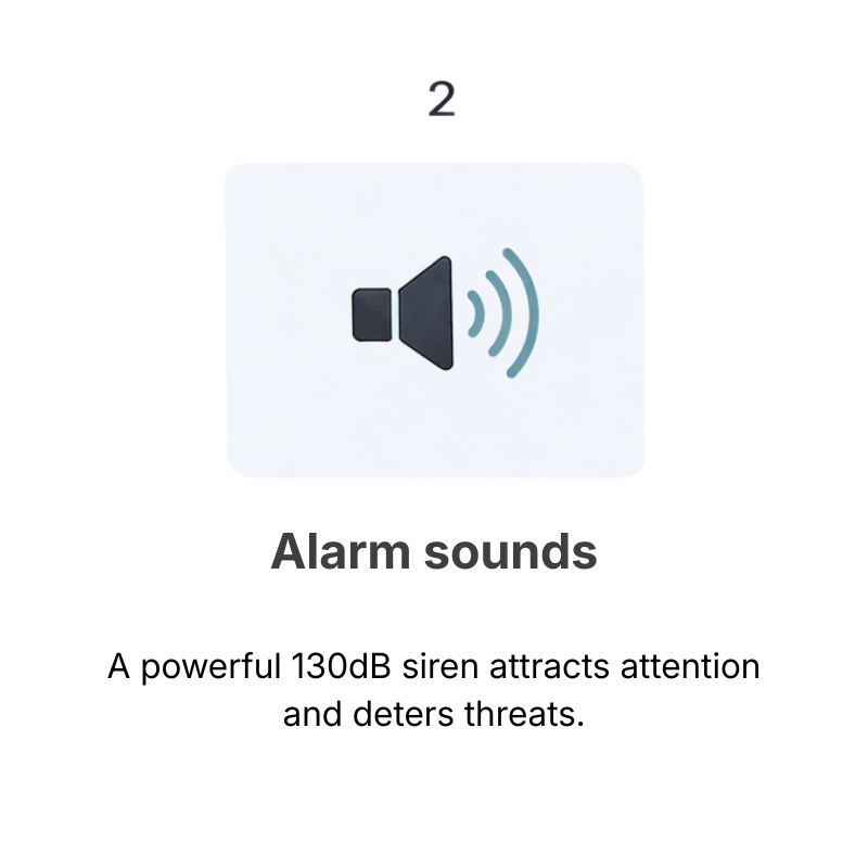 Powerful siren with constant or flashing LED light to attract attention and deter threats.